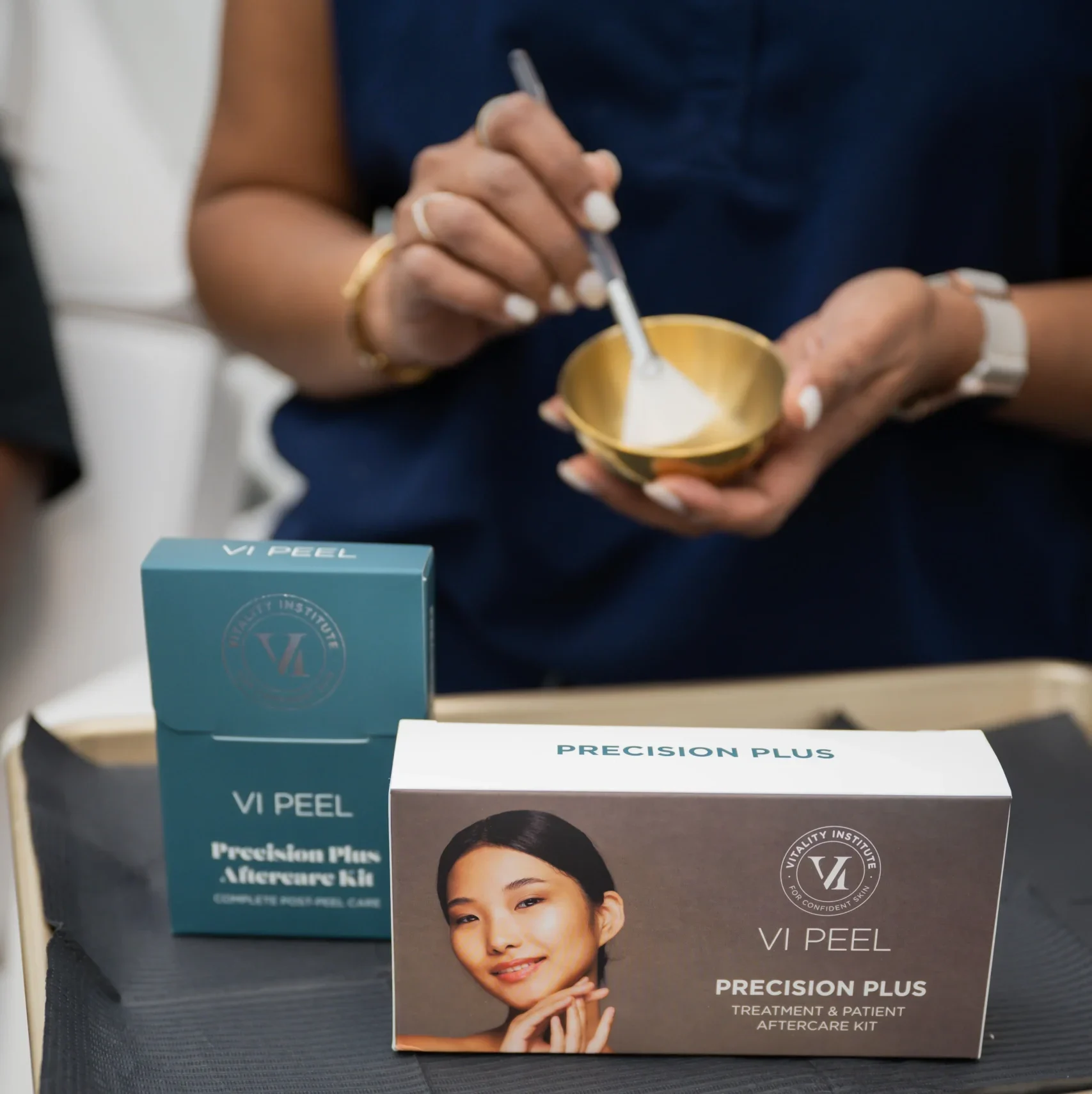 - VI Peel Precision Plus: This powerful brightening blend targets stubborn pigmentation, sun damage, and melasma. Precision Plus helps even out skin tone and restores a radiant, uniform complexion.